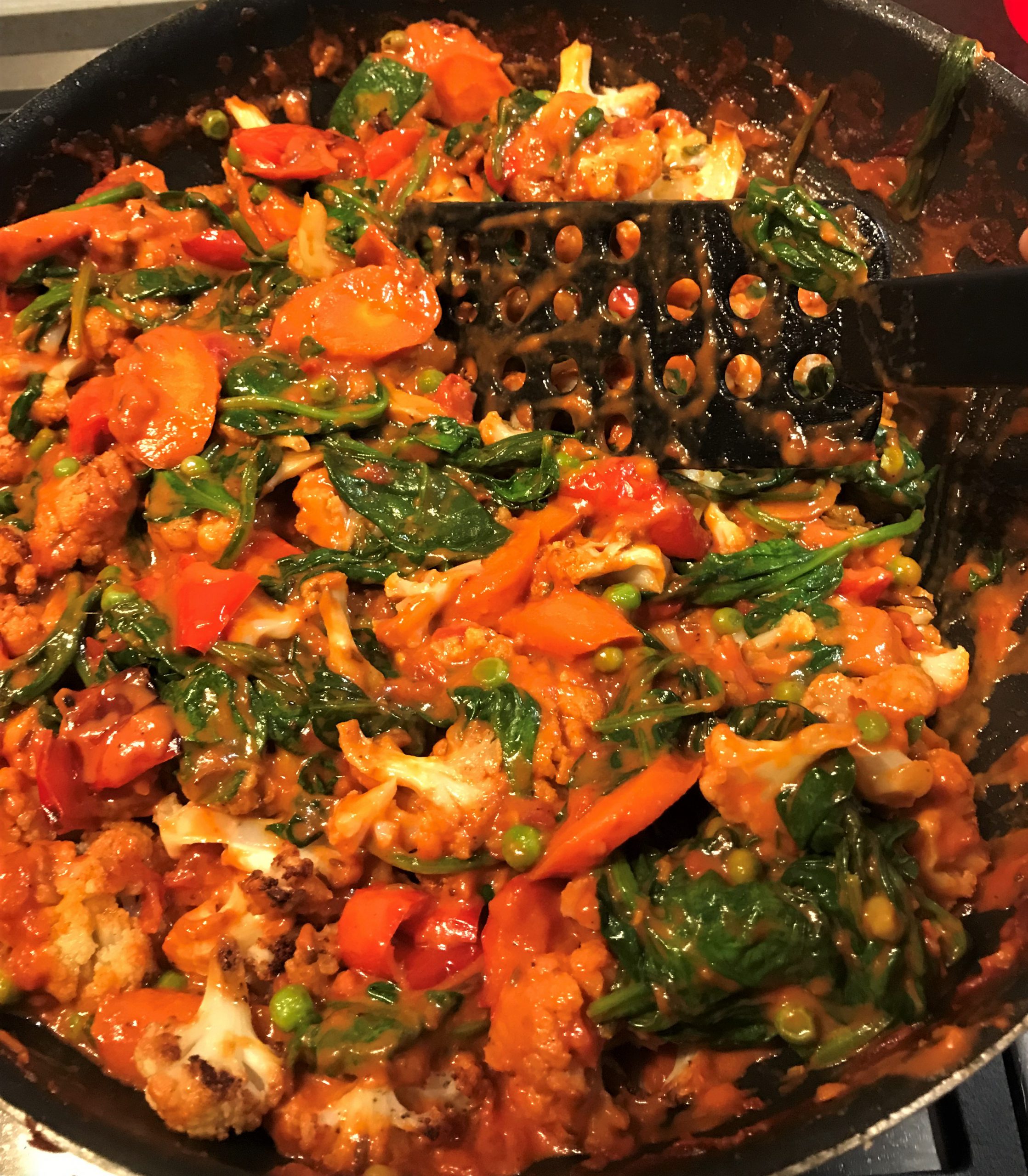 Gordijnen dicht, buiten waait de wind door de straat, de kachel brandt…. Ideaal om deze smakelijke vegetarische curry te maken. En samen met het gezin of vrienden op de bank van te genieten. Het genieten begint al met het klaarmaken. Bij de heerlijke geuren van de groenten en specerijen kun je het niet laten om er al van te snoepen….Trek …